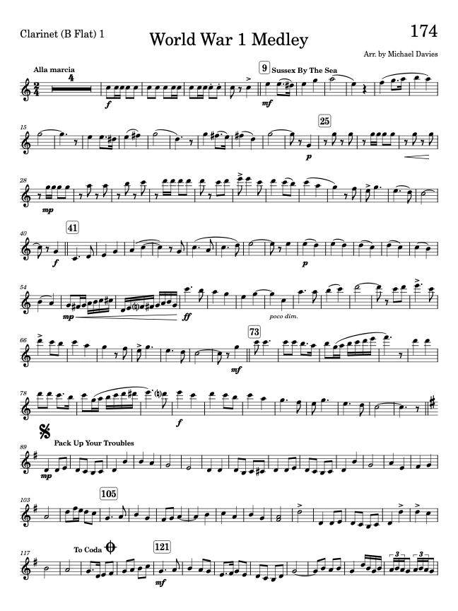 This is an arrangement of popular songs from the first world war. It includes 'Sussex by the Sea', 'Pack up Your Troubles', 'Dolly Gray' and 'It's a long Way to Tickle Mary'