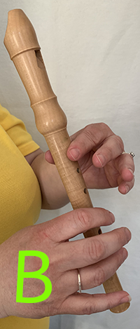 Place the thumb of your right on the back of your recorder behind the forth hole.