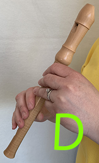 To Play a "D" we do the same as an"E" and the third finger of our right hand on the sixth hole on the front of the recorder.